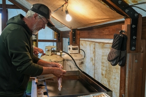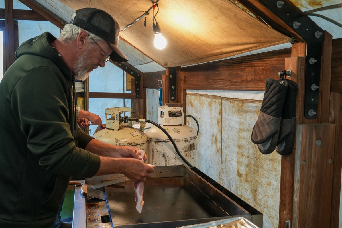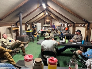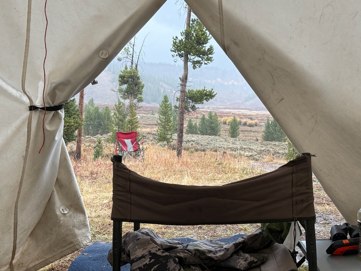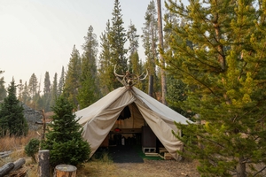 The camp is powered by a generator, ensuring that you have lights in your tents each evening and morning. Our clean, enclosed latrine provides necessary facilities, and our dedicated staff maintains a high standard of cleanliness, with the camp being raked daily and tents swept regularly. Each hunter tent, designed for two hunters to ensure ample space, comes stocked with firewood and kindling. We also have a custom water system set up to bring mountain fresh, potable spring water right into camp. Enjoy your hunt in comfort and style at our well-equipped camp.